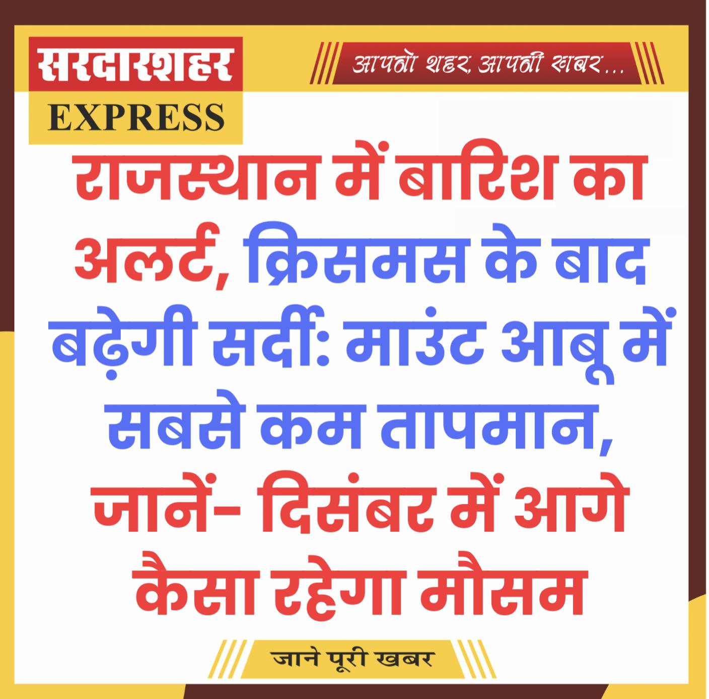 View Allराजस्थान में बारिश का अलर्ट, क्रिसमस के बाद बढ़ेगी सर्दी:माउंट आबू में सबसे कम तापमान, जानें- दिसंबर में आगे कैसा रहेगा मौसम