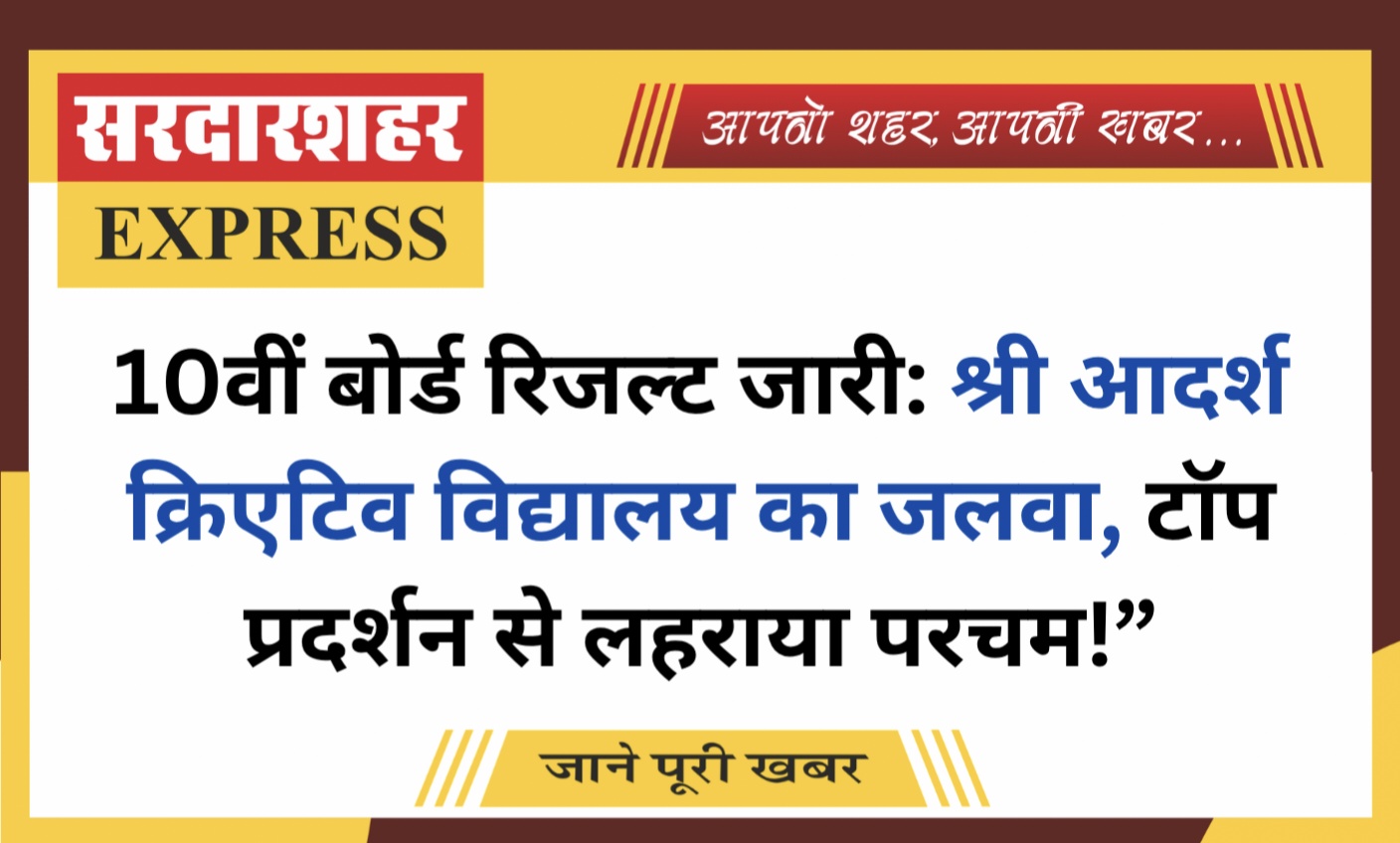 सरदारशहर एक्सप्रेस / मनीष पांडिया। माध्यमिक शिक्षा बोर्ड द्वारा कक्षा 10वीं का परीक्षा परिणाम घोषित कर दिया गया है। परिणाम घोषित होते ही विद्यार्थियों और अभिभावकों में खुशी की लहर दौड़ गई। इसी बीच श्री आदर्श क्रिएटिव उच्च माध्यमिक विद्यालय, सरदारशहर ने शानदार प्रदर्शन करते हुए क्षेत्र में अपना परचम लहराया है। विद्यालय के विद्यार्थियों ने उत्कृष्ट अंक प्राप्त कर न केवल स्कूल का नाम रोशन किया, बल्कि सरदारशहर क्षेत्र की शैक्षणिक प्रतिष्ठा को भी नई ऊंचाइयों पर पहुंचाया। कई छात्रों ने प्रथम श्रेणी में सफलता हासिल की और विद्यालय को गौरवान्वित किया। विद्यालय प्रबंधन और शिक्षकों ने विद्यार्थियों की इस उपलब्धि पर प्रसन्नता व्यक्त करते हुए इसे उनके कठिन परिश्रम, अनुशासन और मार्गदर्शन का परिणाम बताया। इस अवसर पर सफल विद्यार्थियों का स्वागत एवं सम्मान किया गया। प्रधानाचार्य ने सभी छात्रों को उज्ज्वल भविष्य के लिए शुभकामनाएं देते हुए कहा कि इसी तरह निरंतर मेहनत करते हुए वे आगे भी सफलता के नए कीर्तिमान स्थापित करें।