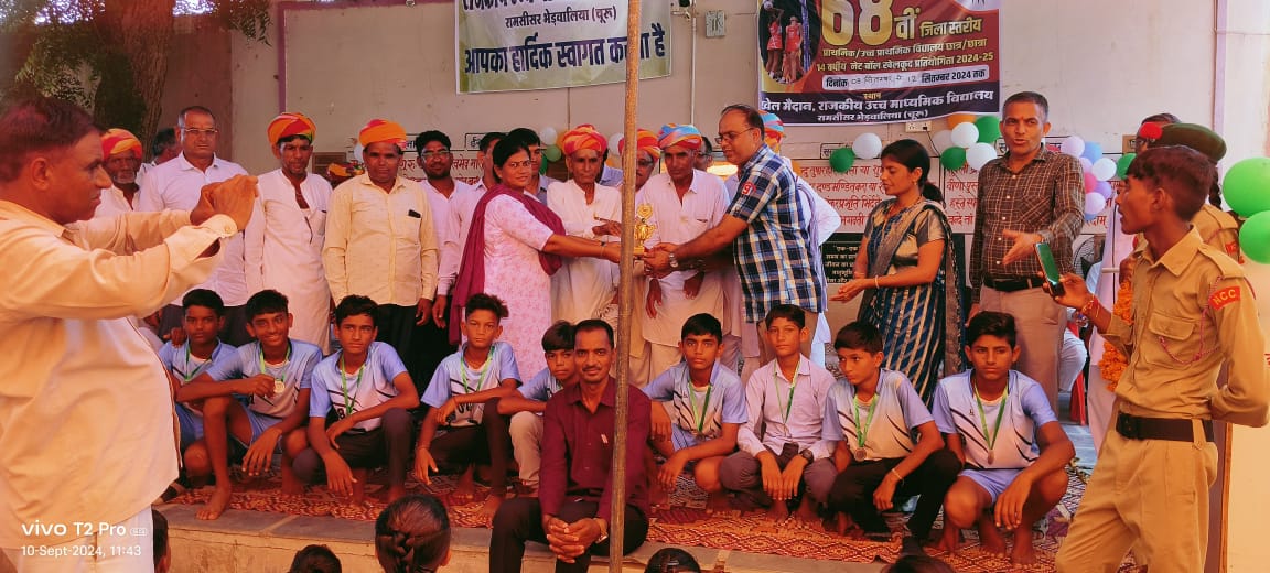 सरदारशहर एक्सप्रेस। राजकीय उच्च माध्यमिक विद्यालय रामसीसर भेड़वालिया के विद्यालय प्रांगण में 68 वीं जिला स्तरीय प्राथमिक /उच्च प्राथमिक 14 वर्षीय नेट बॉल टूर्नामेंट के समापन समारोह का आयोजन किया गया। समारोह में बालिका वर्ग में विजेता राजकीय उच्च माध्यमिक विद्यालय रामसीसर भेड़वालिया,उप विजेता राजकीय उच्च प्राथमिक विद्यालय सैउवा (राजगढ़)तृतीय स्थान प्राप्त राजकीय उच्च प्राथमिक विद्यालय हीराजसर(चूरू)की टीमों और बालक वर्ग में विजेता राजकीय उच्च प्राथमिक विद्यालय हीराजसर उप विजेता राजकीय उच्च माध्यमिक विद्यालय रामसीसर भेड़वालिया तृतीय स्थान प्राप्त राजकीय उच्च प्राथमिक विद्यालय सैउवा (राजगढ़) की टीमों के खिलाड़ियों एवं उनके प्रभारी शारीरिक शिक्षकों को सम्मानित किया गया।