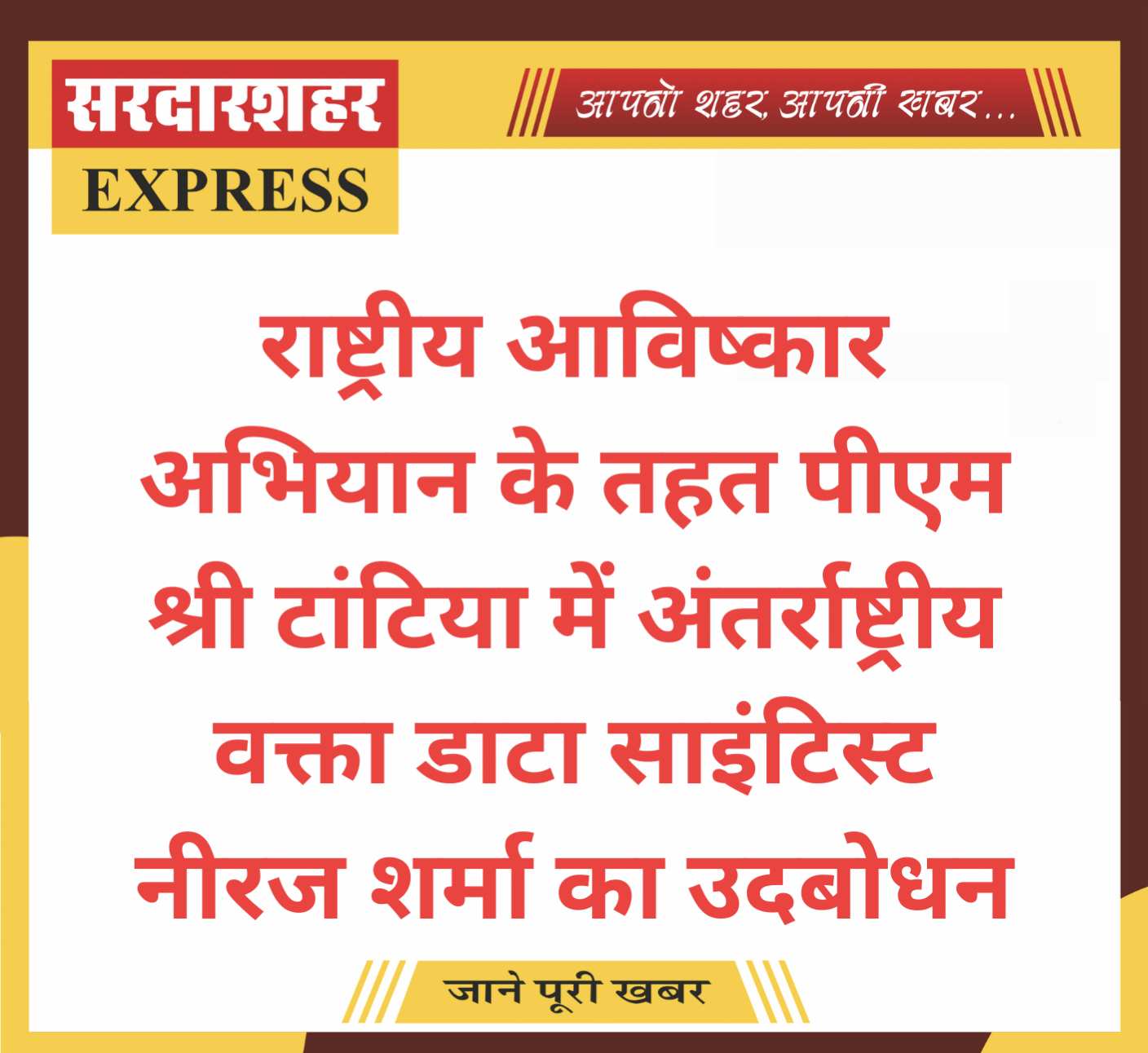 सरदारशहर एक्सप्रेस 22 जनवरी 2026/ मनीष पांडिया। पीएमश्री विद्यालय राजकीय गिरधारी लाल शिवलाल टांटिया में राष्ट्रीय आविष्कार अभियान के तहत अंतरराष्ट्रीय स्तर के वक्ता का उद्बोधन गतिविधि का आयोजन आयोजन किया गया। हर वर्ष विज्ञान एवं प्रौद्योगिकी तथा गणित के क्षेत्र में परामर्श और मार्गदर्शन देने के लिए भारत सरकार द्वारा पीएम श्री विद्यालयों में अंतरराष्ट्रीय स्तर के वक्ता को आमंत्रित किया जाता है। इसका उद्देश्य विद्यार्थियों के प्रदर्शन और क्षमता को अधिकतम करने के साथ-साथ उनके कौशल को विकसित करने तथा गणित-विज्ञान एवं प्रौद्योगिकी के प्रति रुचि जागृत करने में महत्वपूर्ण भूमिका निभाता होता है। क्योंकि विज्ञान एवं प्रौद्योगिकी क्षेत्र में परामर्श प्रक्रिया छात्रों को बेहतर पेशेवर लक्ष्यों को पहचान करने और उन्हें प्राप्त करने में सहायता प्रदान करती है। इस गतिविधि के तहत अंतर्राष्ट्रीय वक्त नीरज शर्मा जो वर्तमान में अमेरिका के कैलिफोर्निया प्रांत में वॉलमार्ट में डाटा साइंटिस्ट (वैज्ञानिक) के पद पर कार्यरत है एवंकंप्यूटर साइंस स्पेशलाइजेशन इन डाटा साइंस अमेरिका के मैसाच्युसेट्स एमहरस्ट शहरसे एमएससी है। नीरज ने कंप्यूटर साइंस एंड टेक्नोलॉजी में आईआईटी मंडी हिमाचल प्रदेश जो देश का प्रतिष्ठित प्रौद्योगिकी संस्थान है के द्वारा बीटेक 9 से ज्यादा सीजीपीए अंक लाकर की एवं सरदारशहर चुरु राजस्थान का नाम रोशन किया है। ऐसे अंतर्राष्ट्रीय वक्ता उद्बोधन के दौरान नीरज ने बताया कि हम कैसे वर्तमान में प्रौद्योगिकी के साथ तालमेल बिठाकर अपने जीवन को बेहतर कर सकते हैं। नीरज ने बताया कि विद्यार्थी को ज्यादा से ज्यादा अपने टीचर से विषय संबंधी प्रश्न करके अपनी जिज्ञासाओं को शांत करना चाहिए तथा विषय की जानकारी बढ़ानी चाहिए एवं विद्यार्थी को सदैव ही अपने आप को आगे बढ़ाने के लिए प्रेरित करते रहना चाहिए। इस अवसर पर विद्यालय प्रधानाचार्य विजय कुमार पारीक ने बताया कैसे हिंदी मीडियम सरदाशहर में पढ़ा हुआ विद्यार्थी कैसे ईट तक पहुंचा एवं वर्तमान में अमेरिका के कैलिफोर्निया में वालमार्ट में डाटा साइंटिस्ट के पद पर कार्यरत है। यह हमारे लिए गौरव का विषय है, प्रधानाचार्य ने कहा इससे यह भी प्रेरणा मिलती है कि अपने में से ही कोई हिन्दी माध्यम का विद्यार्थी उच्च पद पर पदस्थापित हो सकता है। इस कार्यक्रम में उप्राचार्य राजकुमार माली,रेणु शर्मा, एवं विद्यालय स्टाफ में विकास परीक,रेखा पुरोहित,मुन्नी शर्मा, राजकुमार पालीवाल,सन्त कुमार बाना,कृष्णगोपाल, ताराचंद शर्मा ,आशाराम राजेंद्र ,राजवीर ,मनीष सहित समस्त टांटिया स्टाफ उपस्थित रहा है। कार्यक्रम का संचालन पीएमश्री प्रभारी राकेश 