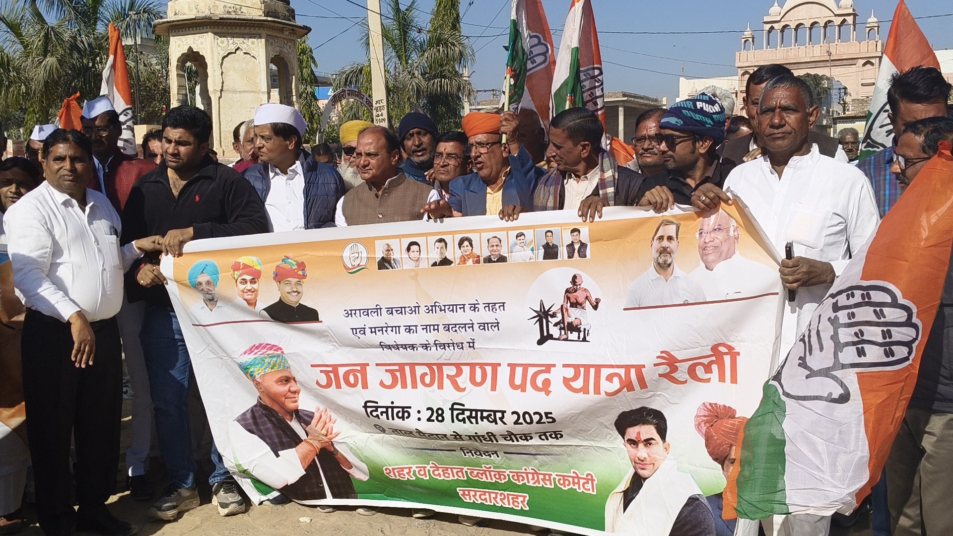 सरदारशहर एक्सप्रेस 28 दिसंबर 2025/ मनीष पांडिया। सरदारशहर विधायक पं. अनिल शर्मा के नेतृत्व में कांग्रेस कार्यकर्ताओं ने अरावली बचाओ अभियान तथा मनरेगा योजना का नाम बदलने के विरोध में जोरदार रैली निकालकर अपना आक्रोश प्रकट किया। रैली ताल मैदान से प्रारंभ होकर गांधी चौक तक पहुंची, जहां कार्यकर्ताओं ने नारेबाजी करते हुए भाजपा सरकार के खिलाफ विरोध दर्ज कराया। रैली को संबोधित करते हुए विधायक पं. अनिल शर्मा ने कहा कि अरावली पर्वत श्रृंखला राजस्थान की पहचान और प्राकृतिक धरोहर है। इसके संरक्षण के लिए कांग्रेस पार्टी का संघर्ष लगातार जारी रहेगा।