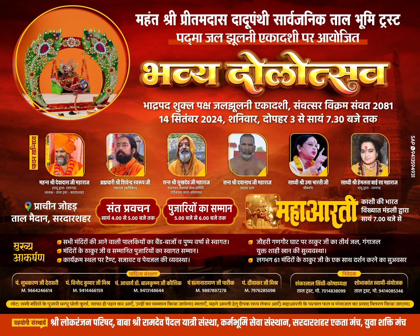 सरदारशहर एक्सप्रेस। स्थानीय ताल मैदान में महन्त प्रीतमदास दादूपंथी ताल भूमि सार्वजनिक ट्रस्ट द्वारा जलझूलनी एकादशी के उपलक्ष में भव्य दोलोत्सव का आयोजन दोपहर 3 बजे से सांय 7:30 बजे तक प्रसिद्ध गणगौर घाट के सामने किया जाएगा। इस संदर्भ में जानकारी देते हुए ताल भूमि ट्रस्ट संयोजक शोभाकांत स्वामी ने बताया कि पिछले कई वर्षों से यह आयोजन ताल ट्रस्ट द्वारा करवाया जा रहा है जिसमे शहर के सभी मंदिरों से ठाकुरजी की पालकियां गणगौर घाट आती है जहां तीर्थ जल गंगा जल से शाही स्नान करवाया जाता है साथ ही कार्यक्रम में पधारे सन्तो के प्रवचन, शहर के सभी मंदिरों के पुजारियों का सम्मान किया जाता है। इस दोलोत्सव कार्यक्रम का मुख्य आकर्षण काशी के पंडितों द्वारा भव्य एवम मनोरम गंगा आरती होती है। कार्यक्रम की सफल क्रियान्विति हेतु श्री लोकरंजन परिषद, बाबा रामदेव पैदल यात्री संस्था, कर्मभूमि सेवा संस्थान, सरदारशहर एकता मंच, युवा शक्ति मंच आदि सामाजिक संगठनों के सदस्य सहयोग कर रहे हैं।