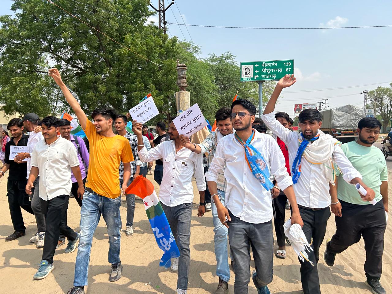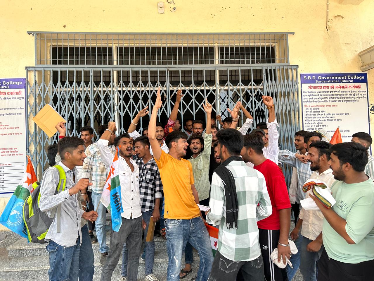 सरदारशहर एक्सप्रेस। आज NSUI ज़िला प्रवक्ता संजय सिद्ध, छात्रनेता संदीप कड़वासरा एंव पूर्व छात्रसंघ अध्यक्ष प्रत्याशी भागीरथ जोशी के नेतृत्व में NSUI सरदारशहर द्वारा मुख्य माँग छात्रसंघ चुनाव बहाल कराने एन्वं साथ ही महाविद्यालय की अन्य माँगो को लेकर महाविद्यालय के मुख्य द्वार पर ताला लगाकर महाविद्यालय के आगे मुख्य सड़क पर मुख्यमंत्री भजनलाल शर्मा का पुतला दहन कर नारेबाज़ी की। भागीरथ जोशी ने बताया कि छात्रसंघ चुनाव अगर नहीं होंगे तो विश्वविद्यालयों एन्वं महाविद्यालयों के प्रशासन की कमियों के कारण पीड़ित छात्रो की आवाज़ को बुलंद कोन करेगा। विद्यार्थी अपनी समस्याओं को लेकर कड़कती धूप में बिना किसी लालच के सेवा करने वाले छात्रनेताओं के पास जाता है , AC कमरों में बैठकर राजनीति करने वालों के पास नहीं जाता। इस दौरान NSUI कार्यकर्ता रामलाल कड़वासरा ,किशन सिद्ध,ओमप्रकाश ढाका,पंकज स्वामी,साक्षी स्वामी,आदित्य पारीक,रामदेव स्वामी,रवि भौजक ,रोहित सोनी,अनिल स्वामी,निर्मल,विकी सिद्ध ,मुकुंद,राकेश आदि अन्य NSUI कार्यकर्ता मौजूद रहे।