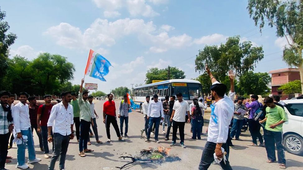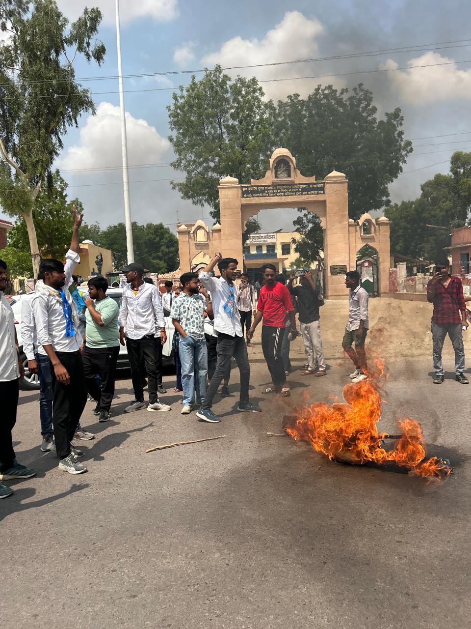 छात्रसंघ चुनाव बहाल कराने व महाविद्यालय की अन्य माँगो को लेकर मुख्य सड़क पर मुख्यमंत्री भजनलाल शर्मा का जलाया पुतला