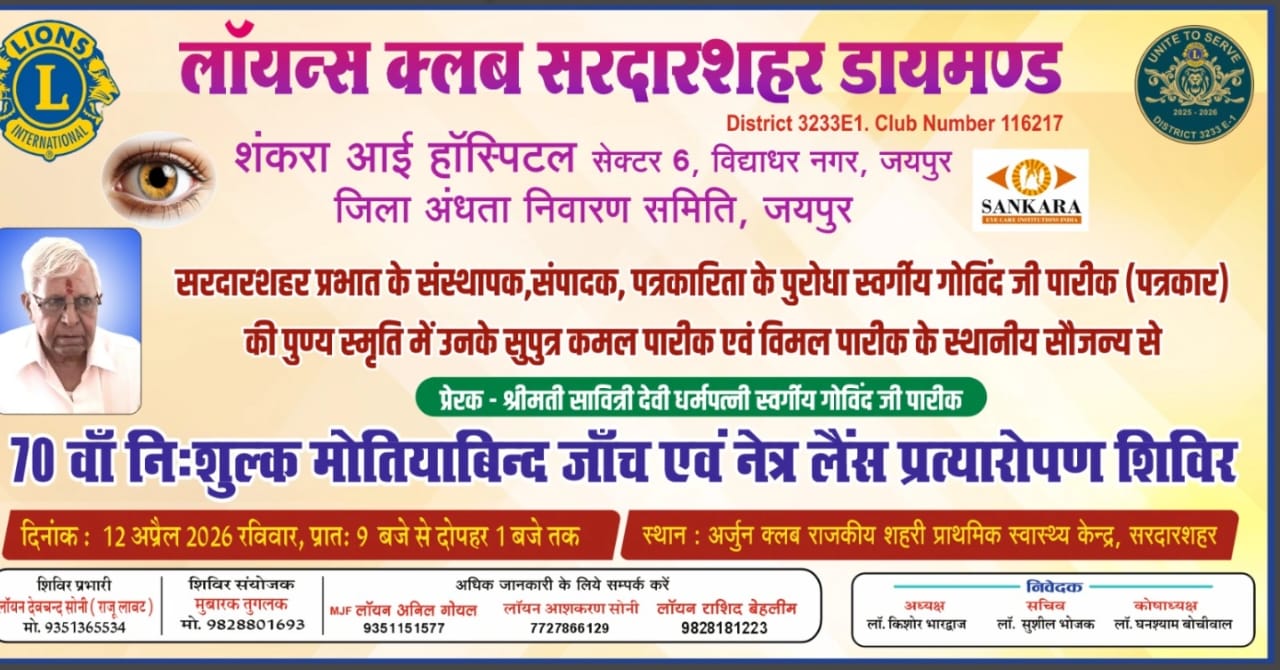 सरदारशहर में 12 अप्रैल को नि:शुल्क मोतियाबिंद जांच व लेंस प्रत्यारोपण शिविर