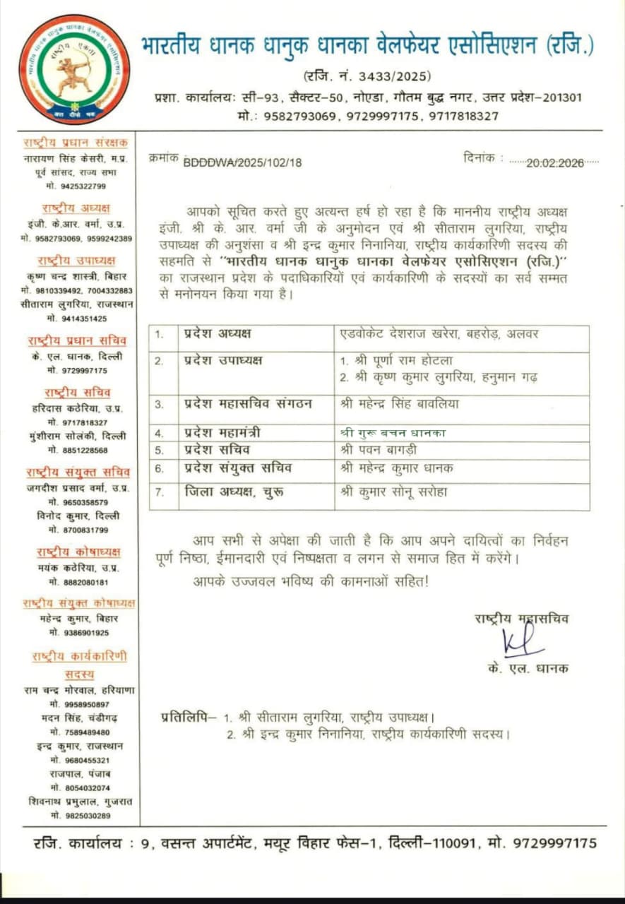 सरदारशहर के गुरू धानका बने ‘भारतीय धानक धानुक धानका वेलफेयर एसोसिएशन’ के प्रदेश महामंत्री