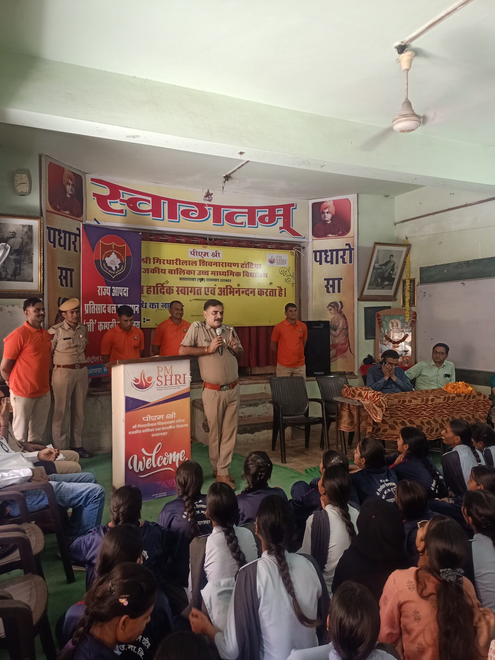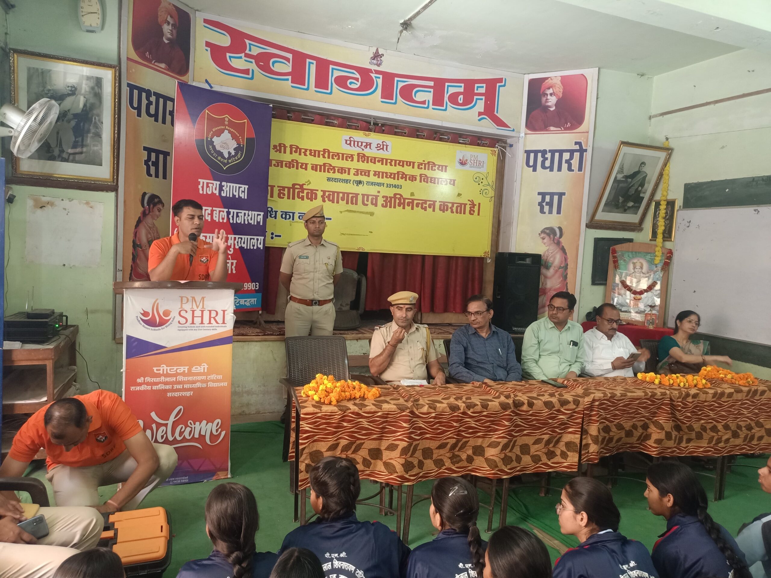 सरदारशहर एक्सप्रेस/ मनीष पांडिया। पीएम श्री गिरधारी लाल शिवनारायण टांटिया राजकीय बालिका उच्च माध्यमिक विद्यालय सरदारशहर में कुलदीप वालिया डीवाईएसपी सरदारशहर, सुभाष बिश्नोई प्लाटून कमांडर एसडीआरएफ एवं उनकी बीकानेर की टीम के नेतृत्व में पीएम श्री टांटिया विद्यालय में आपदा प्रबंधन जागरूकता कार्यक्रम के अंतर्गत विभिन्न प्रकार की आकस्मिक दुर्घटनाओं में पीड़ित को कैसे सहायता प्रदान की जाए इसका अभ्यास करवाया गया। बीकानेर से पधारी एसडीआरएफ टीम के सदस्यों ने डूबते व्यक्ति को बचाने, हार्ट अटैक पीड़ित को पीसीआर देने, स्नेक बाइट पीड़ित को प्राथमिक उपचार देने, सिलेंडर में आग लगने पर उसे पर नियंत्रण कैसे करना तथा आपदा के समय नागरिकों के कर्तव्य आदि को लाइव ड्रिल के माध्यम से बेहद शानदार तरीके से समझाया। इस अवसर पर डीवाईएसपी कुलदीप वालिया ने साइबर, सुरक्षा सड़क सुरक्षा तथा महिला सुरक्षा को लेकर विद्यार्थियों से वार्तालाप की तथा उन्हें इसके बारे में विभिन्न प्रकार की जागरूक जानकारियां प्रदान करके सजग रहने की सलाह दी। प्रधानाचार्य श्री विजय कुमार पारीक ने इस कार्यक्रम को ऐतिहासिक बताते हुए पूरी टीम का धन्यवाद ज्ञापित किया।इस कार्यक्रम में उपप्रधानाचार्य राजकुमार माली,प्रथम पारी प्रभारी प्रेमलता चौहान,शिक्षक नेता रतनलाल पांडिया तथा स्टाफ सचिव विकास पारीक, एवं स्टाफगण रेणू शर्मा, रमेश कुमार सैनी,सोनू गुर्जर, सन्त कुमार बाना,कृष्ण गोपाल शर्मा,सोनम पारीक,जुल्फैन,मुन्नी शर्मा,रेखा पुरोहित,मनीष कुमार सेवदा,आसाराम,ताराचंद शर्मा,राजेंद्र प्रसाद,नीलम चौधरी,उर्मिला जाड़ीवाल,नम्रता वर्मा,राजवीर,शशिकांता शर्मा,अशोक जाखड़ लालचंद बेनीवाल,सुमन कंवर, इंदरचंद चिरानिया,नन्दलाल पारीक,उर्मिला धरेन्द्र और जाकिर हुसैन मौजूद रहे। कार्यक्रम का संचालन राकेश सांकृत्य द्वारा किया गया।