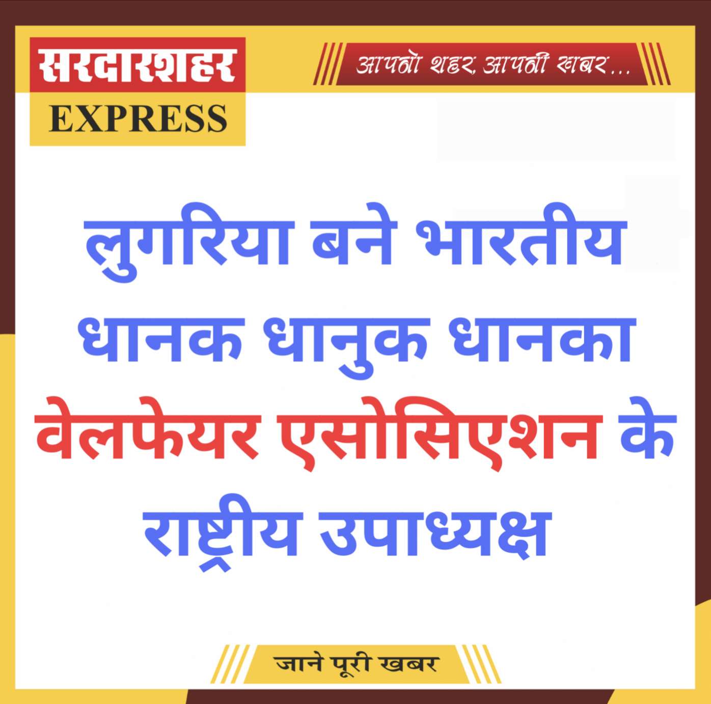 सरदारशहर एक्सप्रेस 20 दिसंबर 2025/ मनीष पांडिया। भाजपा अजा मोर्चा, राजस्थान के प्रदेश मंत्री सीताराम लुगरिया को भारतीय धानक धानुक धानका वेलफेयर एसोसिएशन (रजि.) का राष्ट्रीय उपाध्यक्ष नियुक्त किया गया है। राष्ट्रीय उपाध्यक्ष नियुक्त होने पर सीताराम लुगरिया के लुगरिया फार्म पर पहुंचने पर सर्व समाज के लोगों नें माला पहनाकर और मिठाई खिलाकर नवीन दायित्व की बधाई दी। इस अवसर पर मौजूद लोगों नें सीताराम लुगरिया जिंदाबाद के नारे भी लगाए।