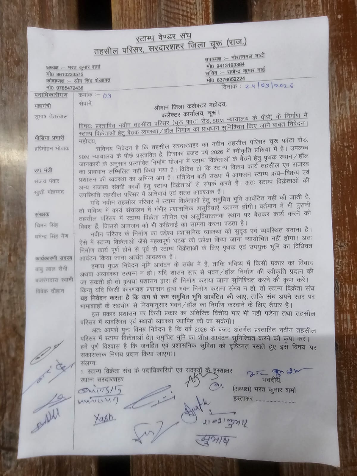 सरदारशहर एक्सप्रेस / मनीष पांडिया। स्टाम्प वेंडर्स युनियन द्वारा आज संगठन के अध्यक्ष भरत शर्मा के नेतृत्व में जिला कलेक्टर से भेंट कर स्टाम्प वेंडरों के पदाधिकारियों द्वारा हस्ताक्षर युक्त प्रमुख मांगों का ज्ञापन सौंपा गया। इस अवसर पर जिला कलेक्टर महोदय चूरु ने सार्थक वार्ता व स्थाई समाधान का विश्वास दिलाया। इस अवसर पर युनियन के अध्यक्ष भरत शर्मा ने नवीन तहसील परिसर में सभी स्टांप वेंडर्स के बैठने के लिए सुव्यवस्थित स्थान उपलब्ध करवाने बाबत ज्ञापन सौंपा गया। ज्ञापन देने वालों में उपाध्यक्ष नवरत्न मल भाटी, कोषाध्यक्ष ओम सिंह शेखावत तथा सचिव राजेंद्र चौहान उपस्थित रहे।
