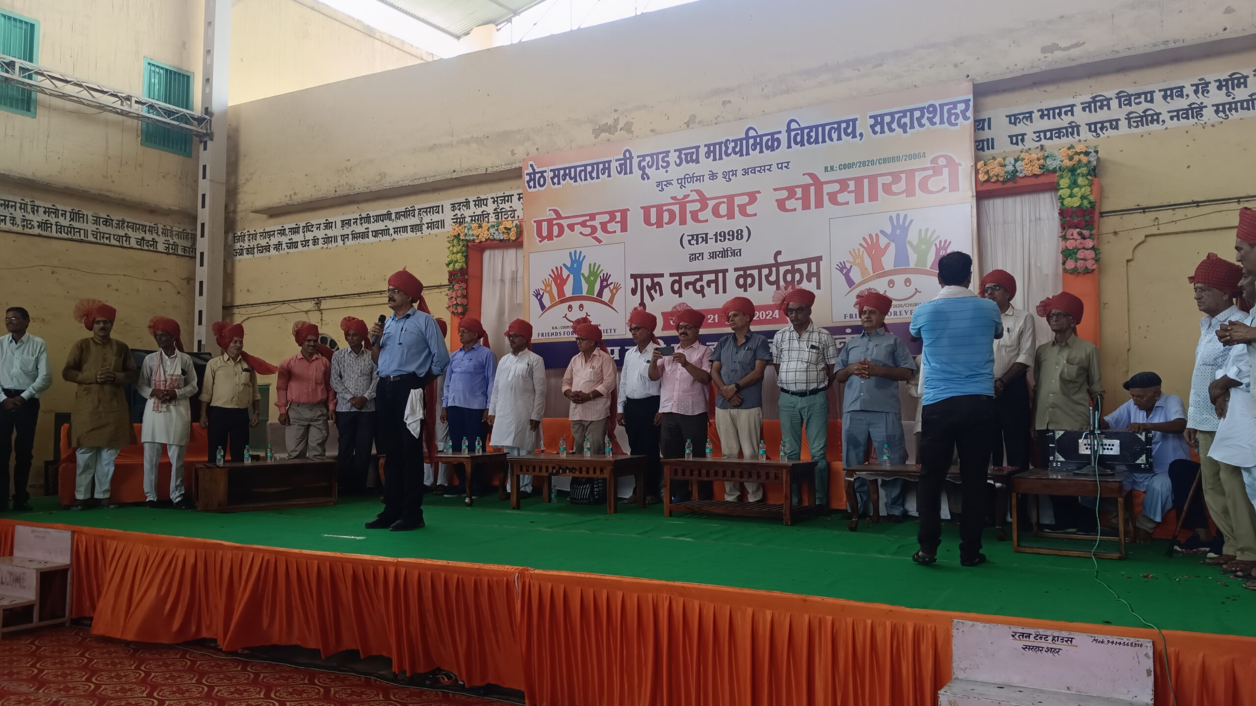 सरदारशहर एक्सप्रेस। गुरू पूर्णिमा के अवसर पर फ्रेन्डस फाँरेवर सोसायटी द्वारा सेठ संपतराम दूगड उमावि के प्रांगण में गुरु वंदना कार्यक्रम का आयोजन किया गया। इससे पूर्व सोसायटी द्वारा बालमंदिर से गुरूजनों को बैंडबाजों के साथ भव्य जुलूस के साथ पुष्प वर्षा करते हुए समारोह स्थल लाया गया।